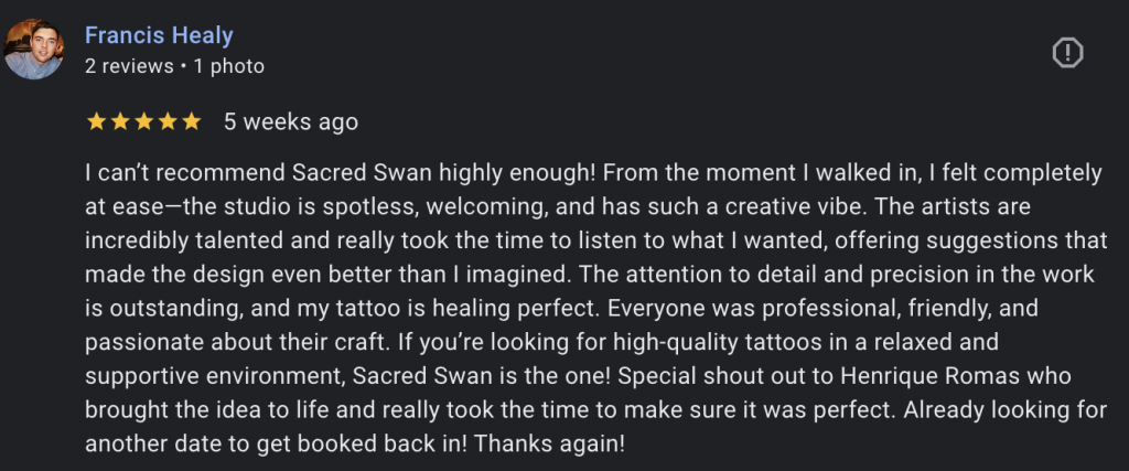 I’m based at Sacred Swan Tattoo on Aigburth Road, near Sefton Park. There’s free roadside parking, making your visit easy and stress-free.